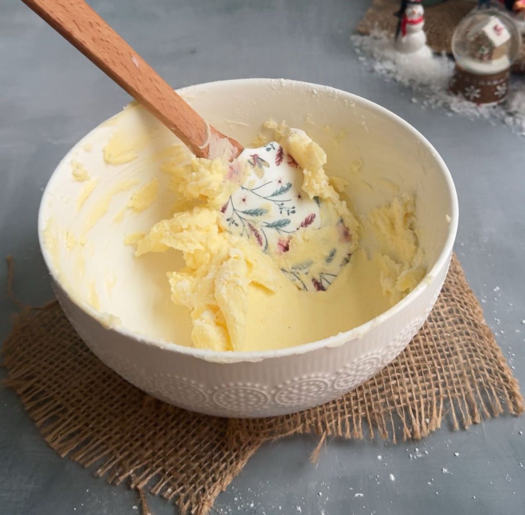 1. In a bowl, add butter and sift icing sugar. Mix well until combined. Now add egg whites and vanilla extract and mix.