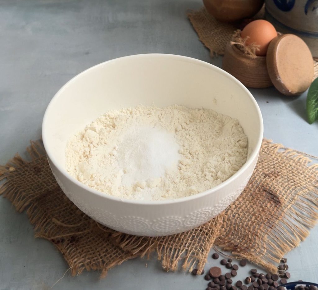 1. In a bowl, whisk together the flour, salt, baking soda, baking powder, white sugar, and brown sugar. Set aside.