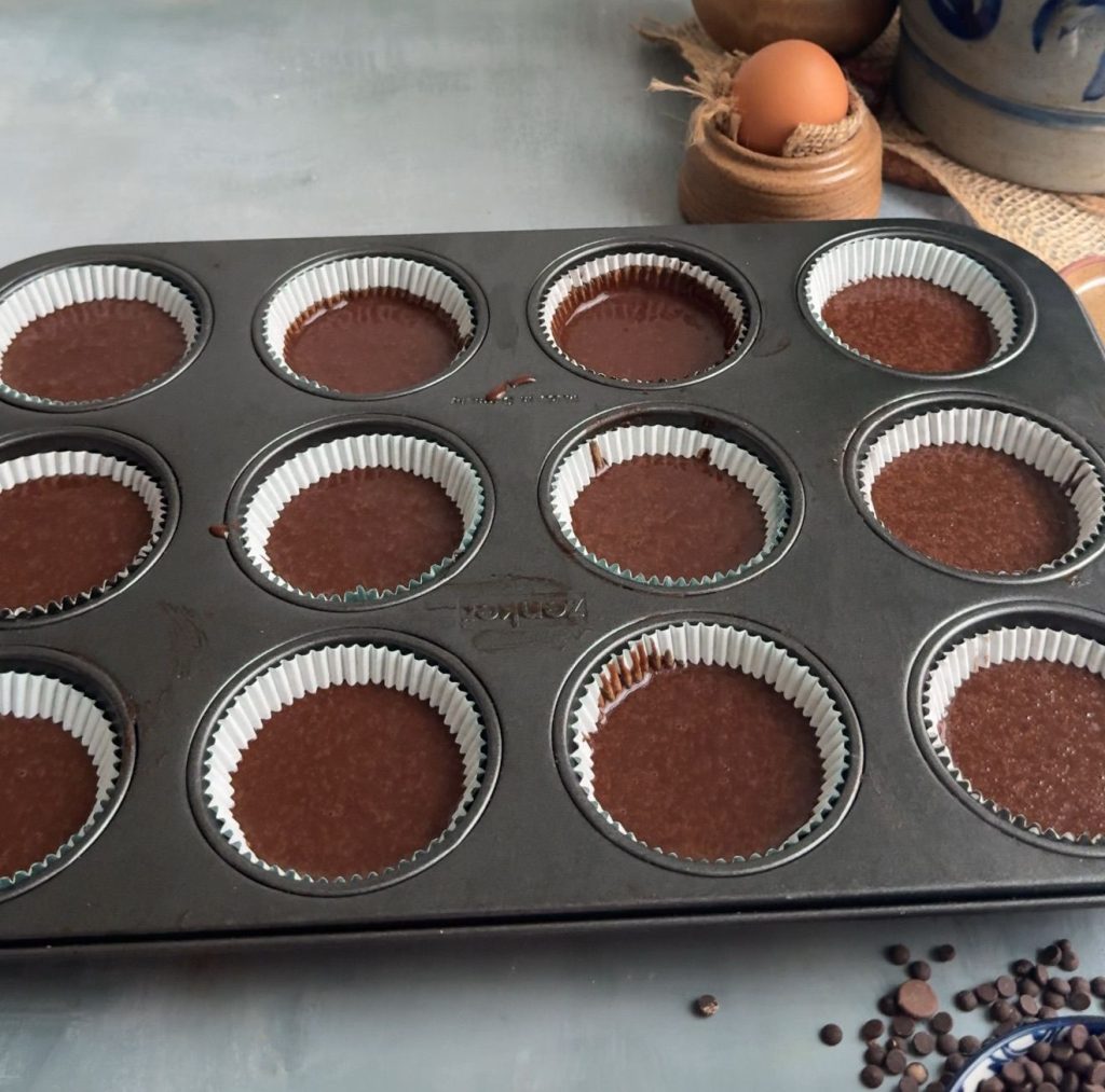 Line your cupcake tray with liners and fill each one about 2/3 full. This gives them enough space to rise perfectly without overflowing.