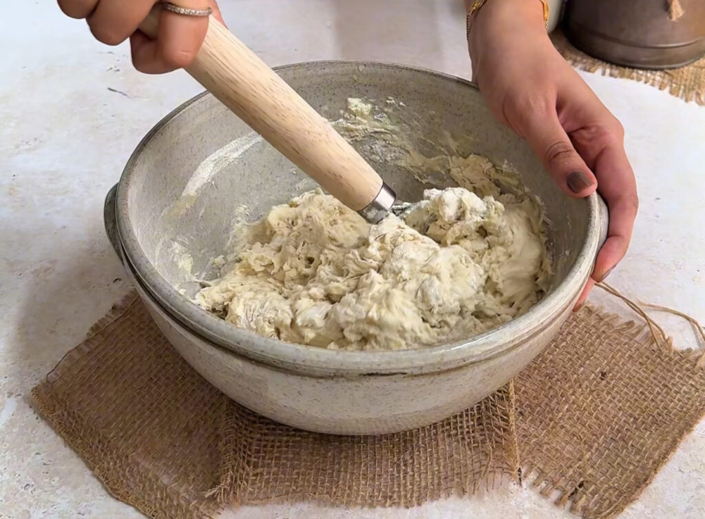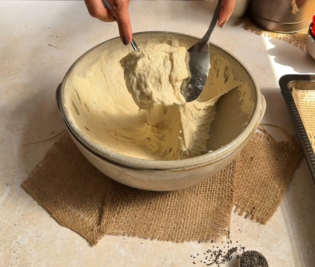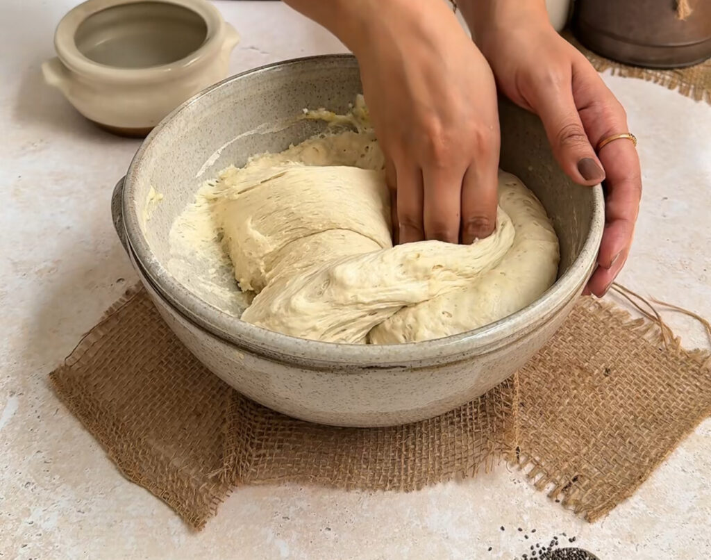 After resting, perform stretch and folds by lifting one side of the dough and folding it over the centre. Repeat all around. This builds structure without kneading and creates an airy crumb.