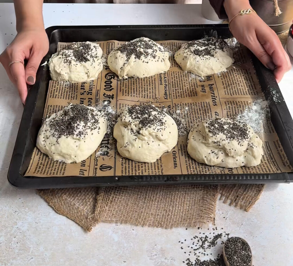 Once risen, scoop portions of dough directly onto a lined baking tray. Sprinkle with chia seeds or preferred toppings, and dust lightly with flour for a rustic artisan look.