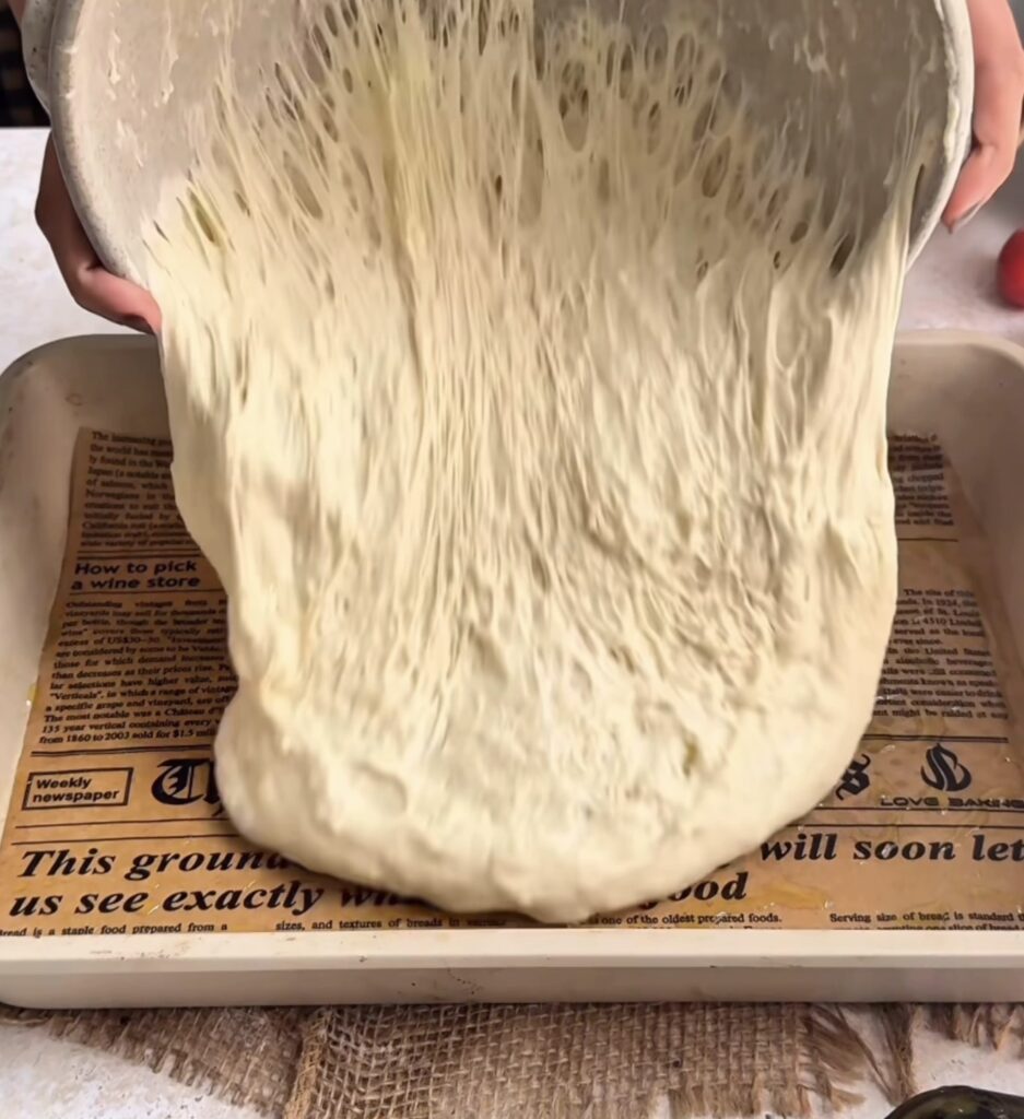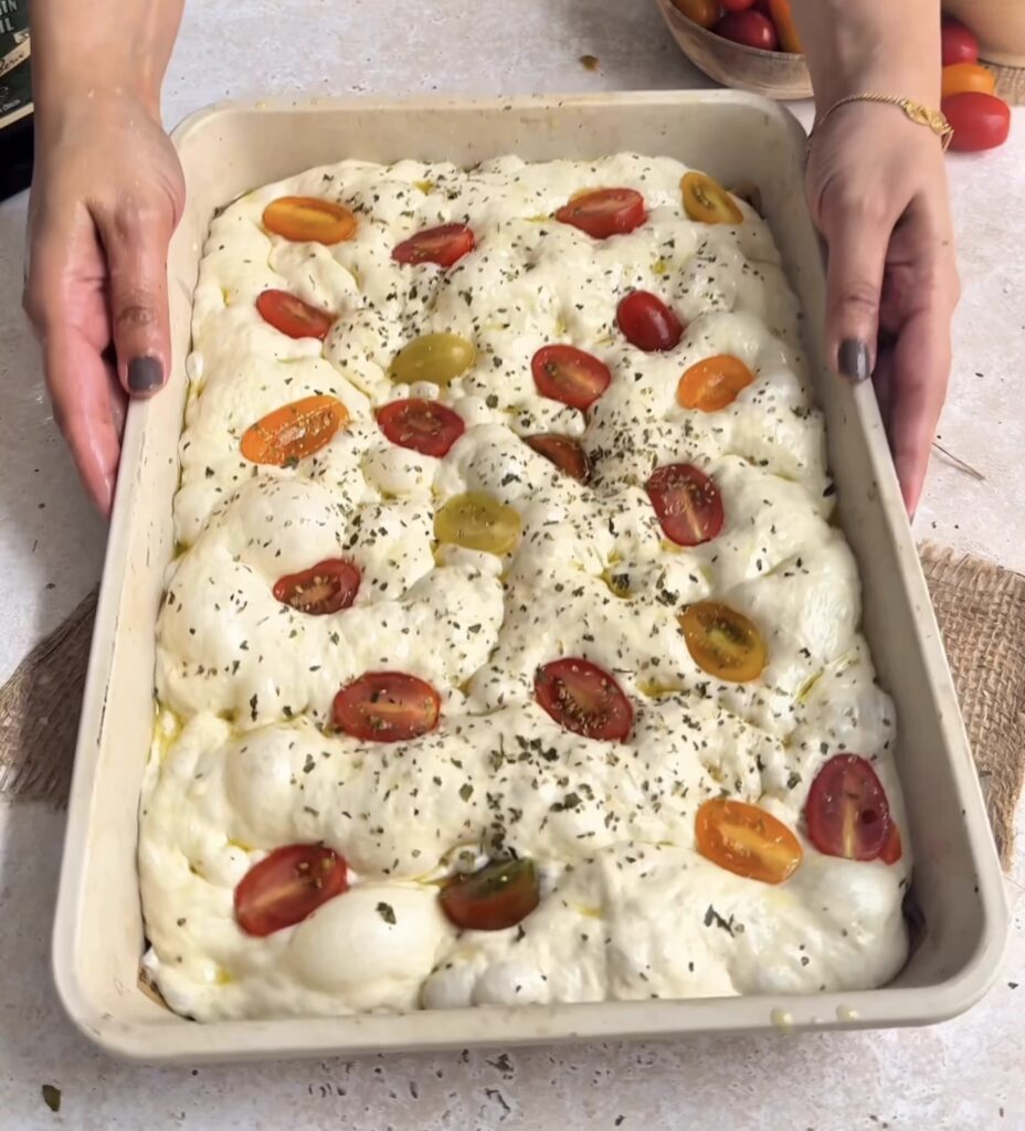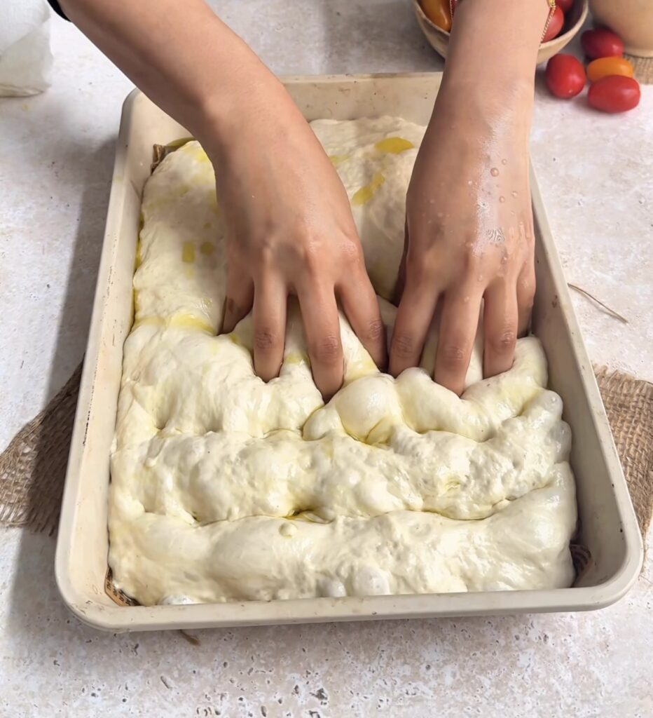 Generously drizzle olive oil into a 9×13 inch baking tray. Then carefully transfer the risen dough into the tray. Instead of stretching it flat immediately, gently perform a coil fold directly inside the tray to maintain air bubbles. Cover and let it rise again for 45 minutes to 1 hour until puffy.