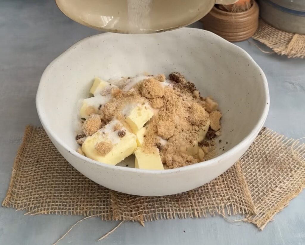 - Beat cold cubed butter with caster sugar and brown sugar until creamy and just combined.