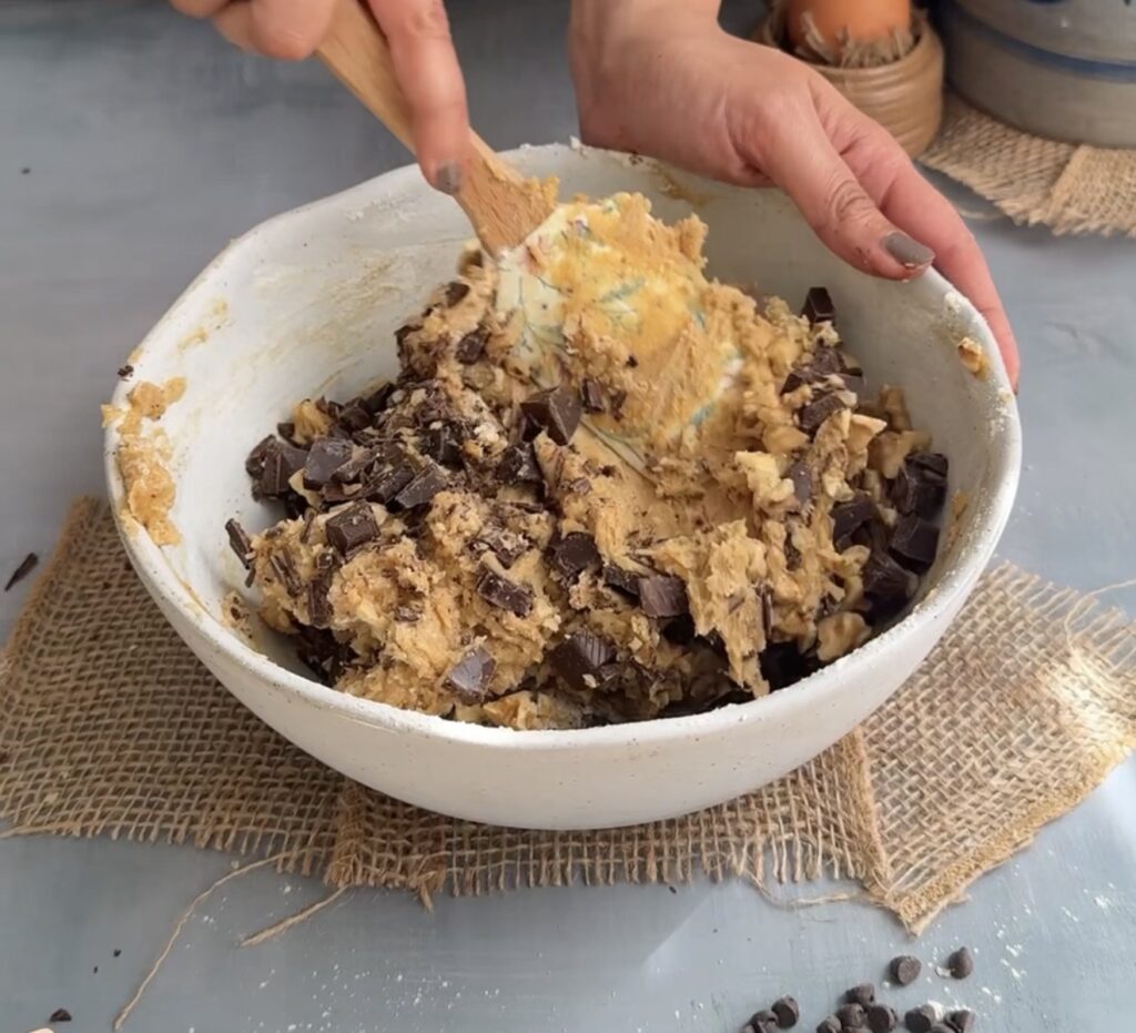 After that, gently fold in the chopped dark chocolate and walnuts. Make sure they are evenly distributed throughout the thick cookie dough.