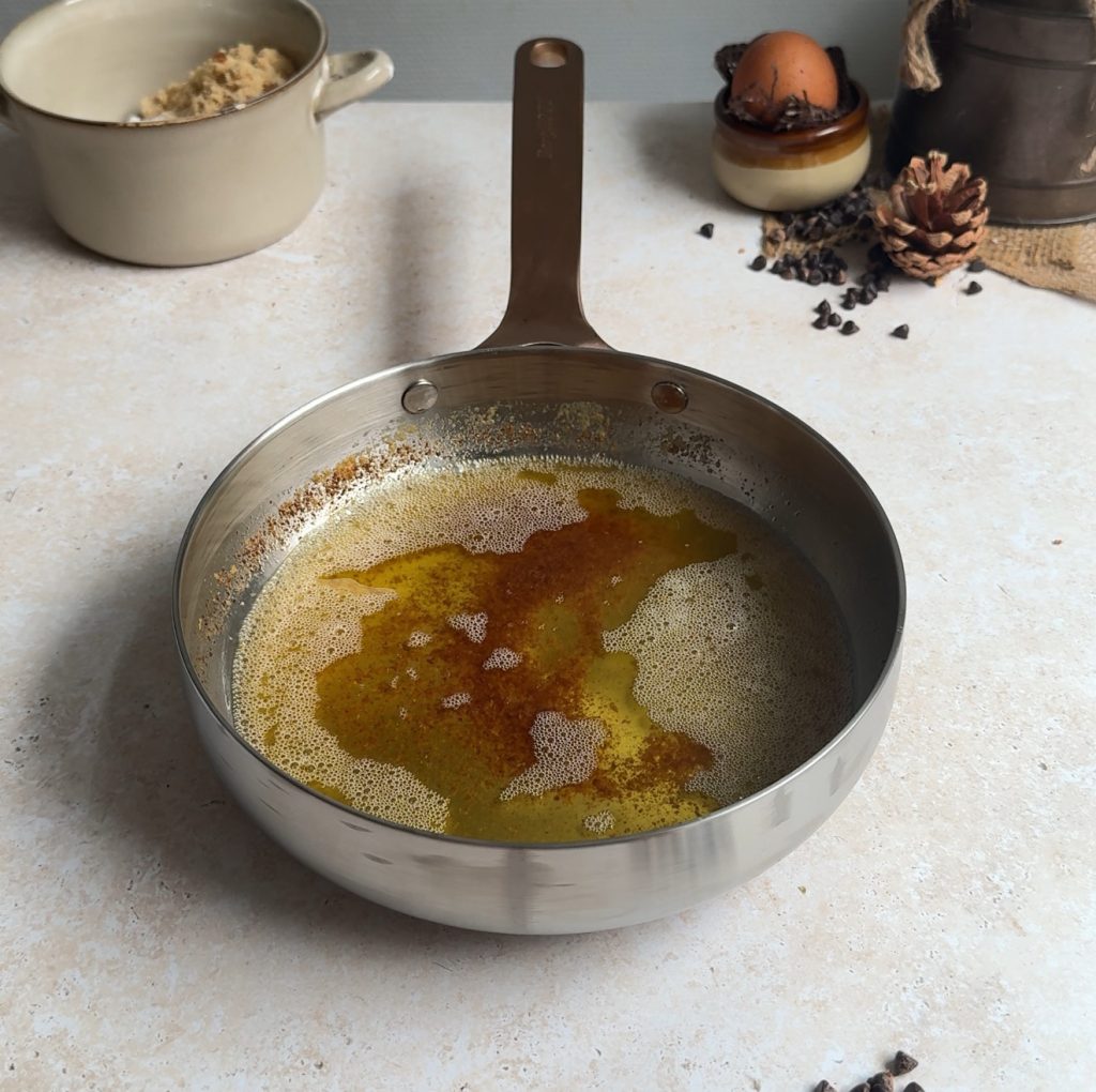 Place your skillet (8-inch works great) on medium heat and add the butter. Let it melt and then continue cooking until it turns golden and smells nutty. This takes just a few minutes.