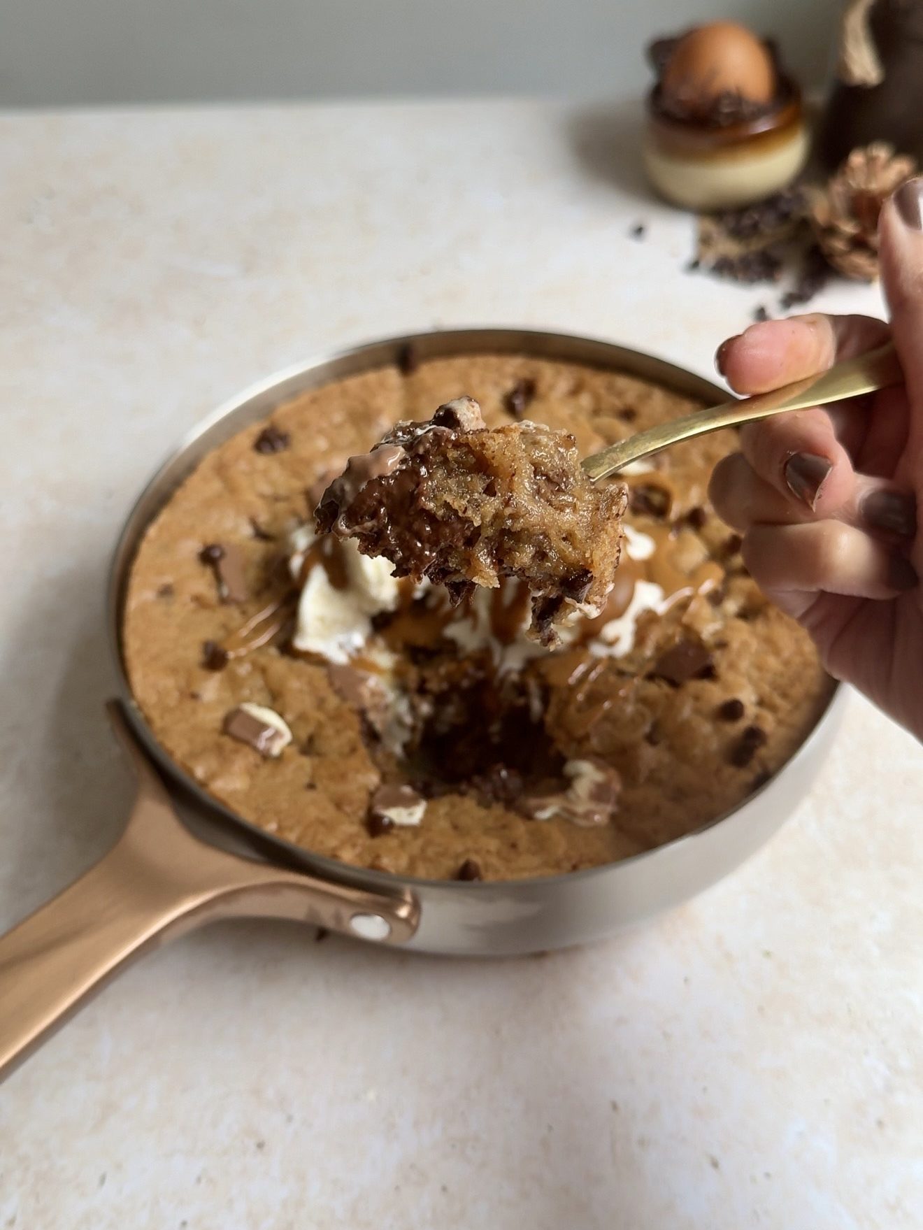• Remove from Oven while centre is Soft – Take the skillet out of the oven while the centre still looks a little soft. It will continue cooking on its own, which is what keeps the middle gooey and perfectly chewy.