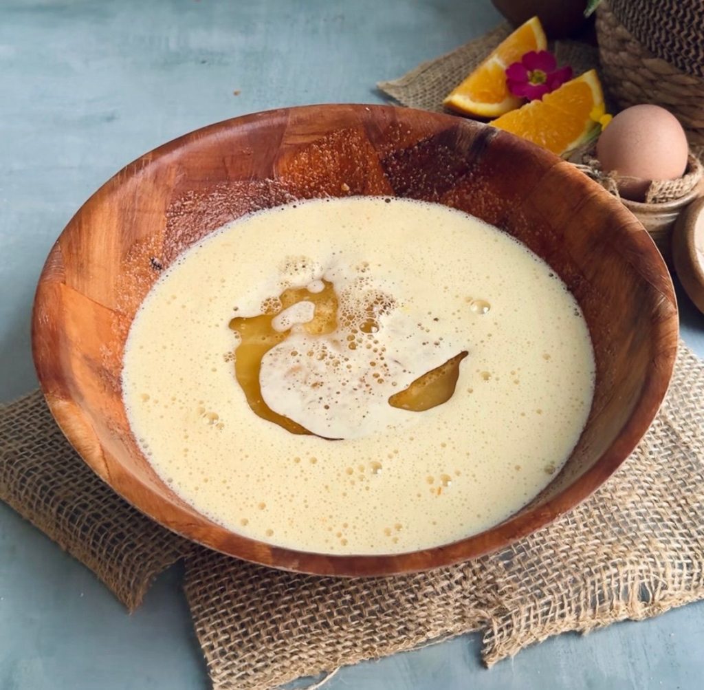 1. Preheat your oven at 170C. In a bowl, add sugar and orange zest and rub it between your fingers until the sugar changes its colour. Now add eggs and vanilla and whisk until light in colour. Now add oil, yogurt and orange juice and mix.