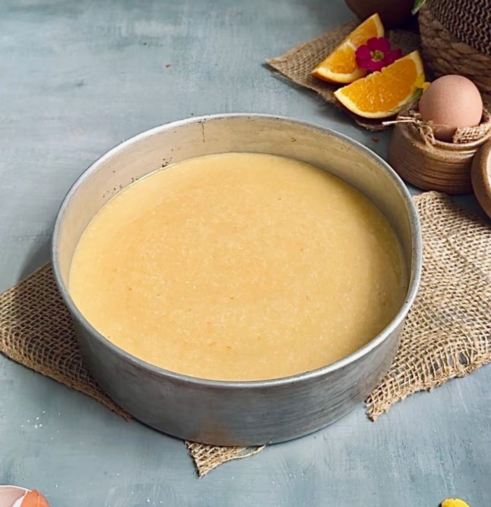 Preheat your oven to 170°C (338°F). Grease and line an 8-inch cake pan with parchment paper. Pour the batter into the pan and smooth the top. Bake for 35–40 minutes or until a toothpick inserted in the centre comes out clean.