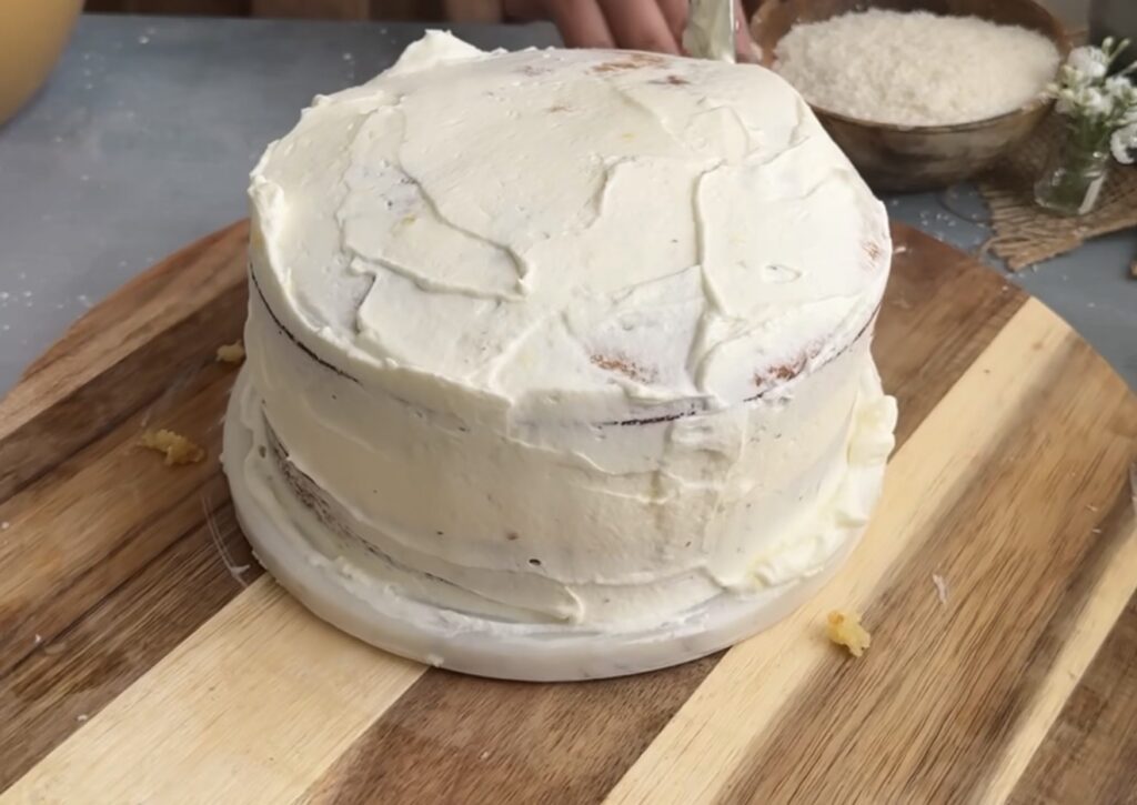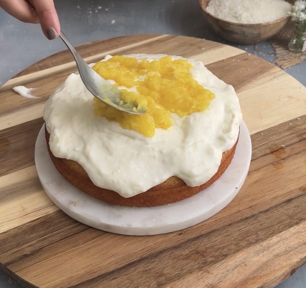 - Place one cake layer on a serving plate, lightly brush with pineapple juice, then spread frosting followed by pineapple filling. Add the second layer and repeat. Frost the outside of the cake and finish by coating with shredded coconut. Decorate with pineapple flowers if desired.