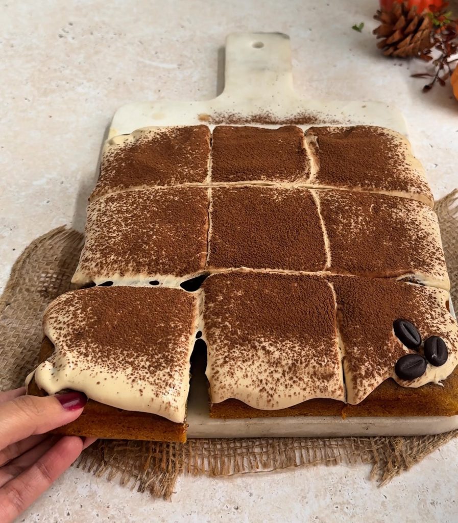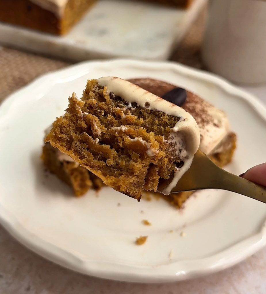 Finally, once the cake is fully cool, spread the chilled frosting evenly over the top. Slice into squares and enjoy this ultra-soft, cosy Pumpkin Spice Latte Cake with the perfect balance of warm spices and creamy coffee frosting.