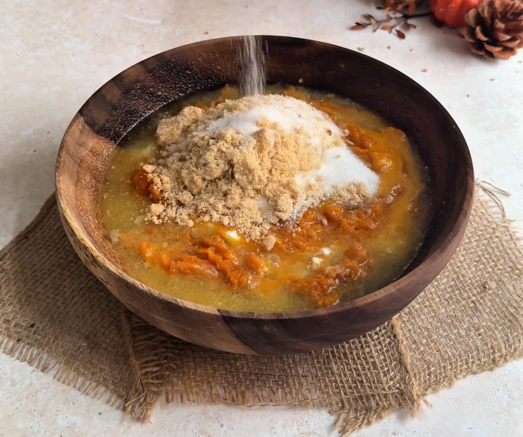 In a large bowl, crack in the eggs and add the oil, cooled melted butter, white sugar, brown sugar, yogurt, pumpkin purée, vanilla, and the dissolved instant coffee. Then whisk everything together until the mixture looks smooth, glossy, and well blended.