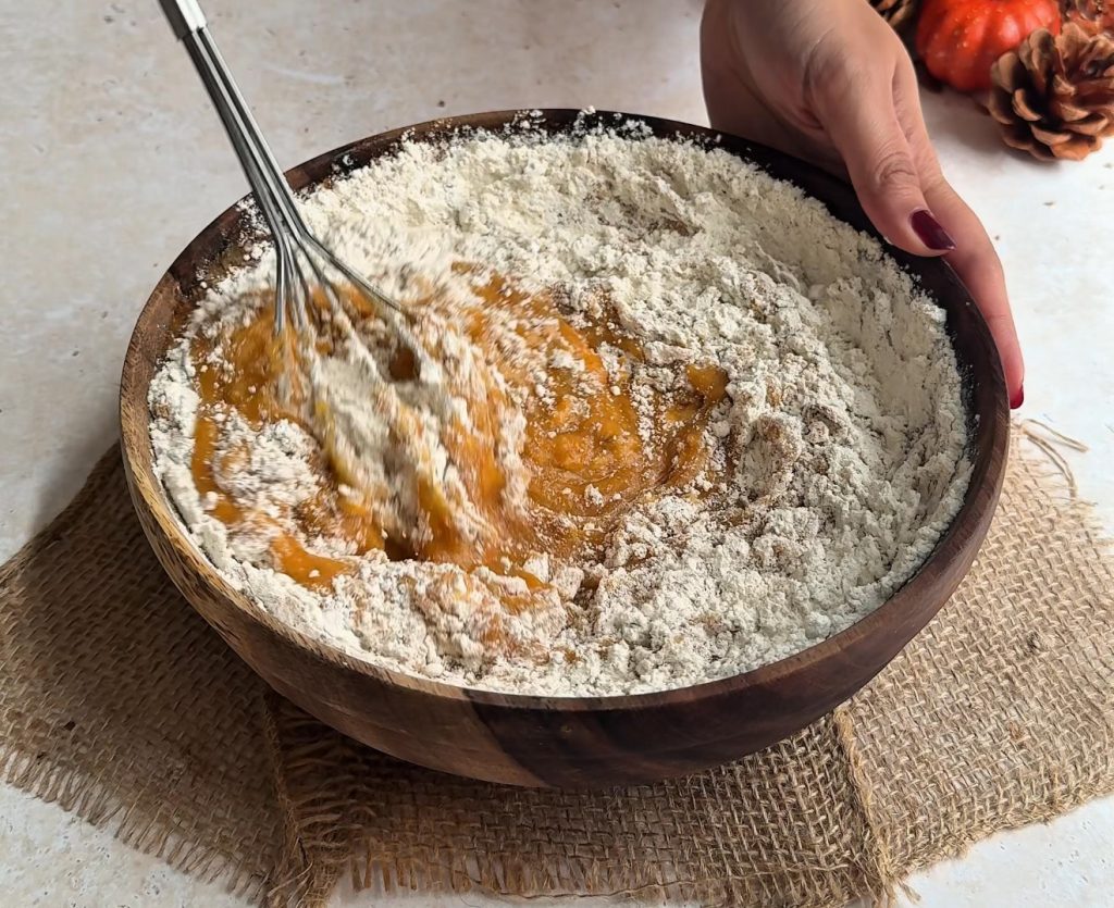 After that, sift the flour, baking powder, baking soda, salt, and pumpkin spice mix directly into the bowl. Gently whisk or fold just until the batter comes together. Be careful to stop mixing as soon as the flour disappears so the cake stays light.
