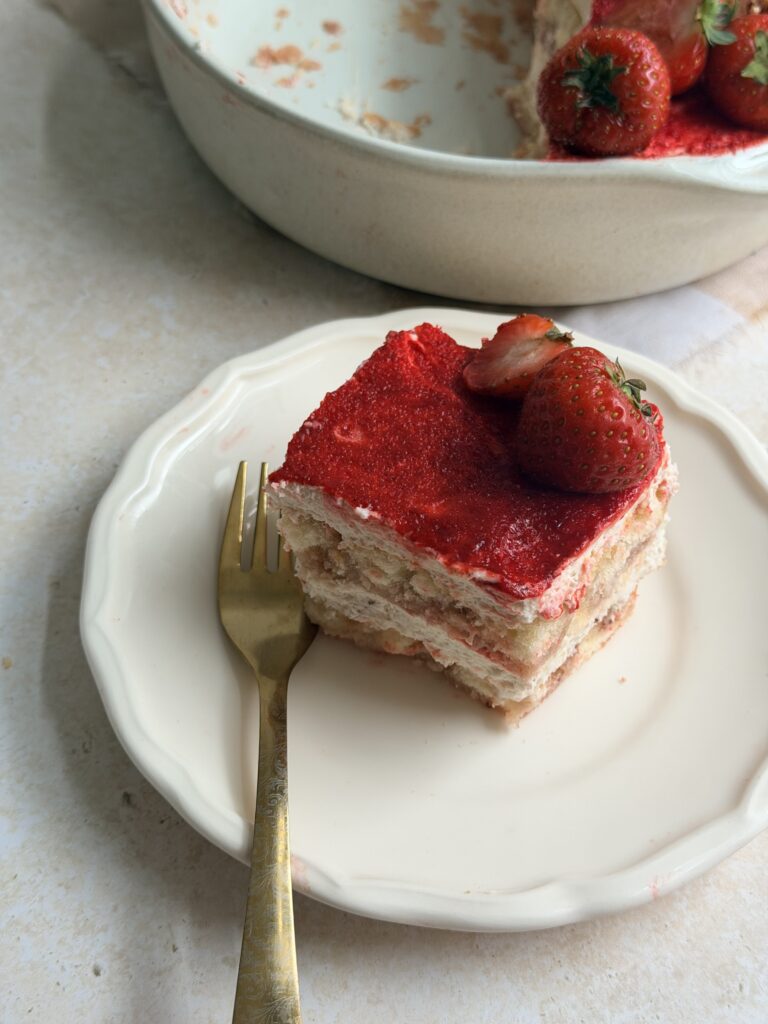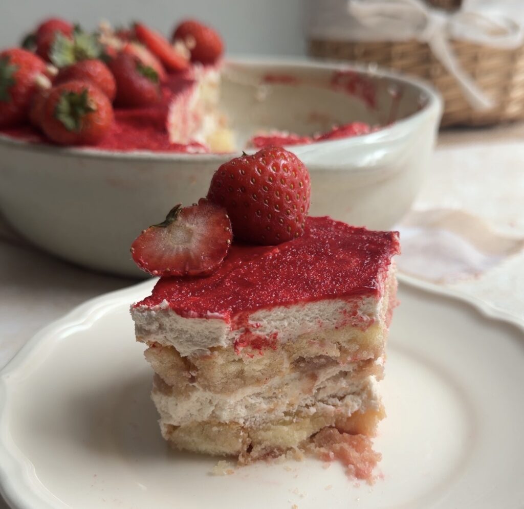 This Strawberry Cheesecake Tiramisu will be loved as it is the perfect combination of creamy, fruity, and light textures. It is an easy dessert that feels elegant and refreshing and honetly perfect for those who don’t like coffee ;).
