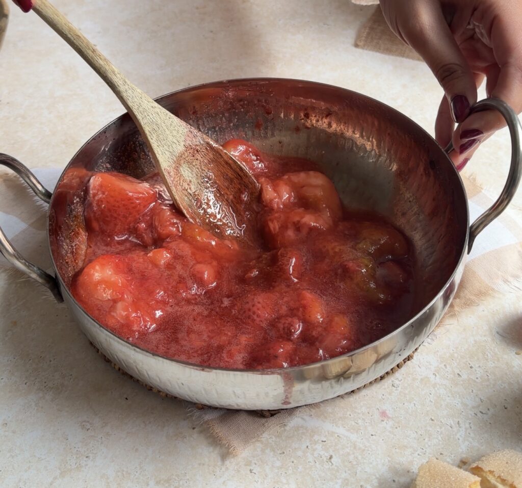 - Cook the strawberry puree until slightly thick – Simmer the frozen strawberries, water, sugar, lemon juice, and salt long enough for the flavours to concentrate and the puree to thicken slightly. This helps create a stronger strawberry flavour for both the tiramisu cream and the dipping syrup.