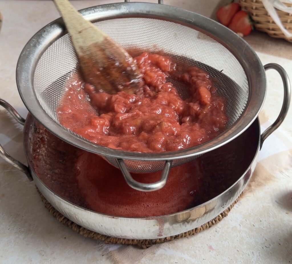 - In a saucepan cook 450g frozen strawberries with 1/2 cup water over medium heat until soft. Mash and strain to remove seeds.