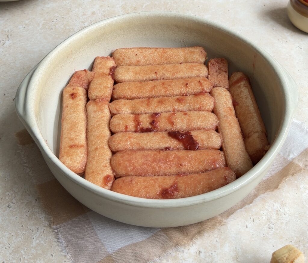 - Dip ladyfingers into the warm strawberry syrup and arrange a layer in a 10–11 inch round dish. Spread half of the strawberry mascarpone cream over the ladyfingers.