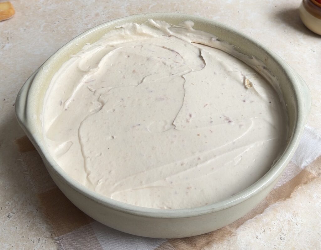 - Arrange another layer of dipped ladyfingers and spread the remaining cream evenly on top.