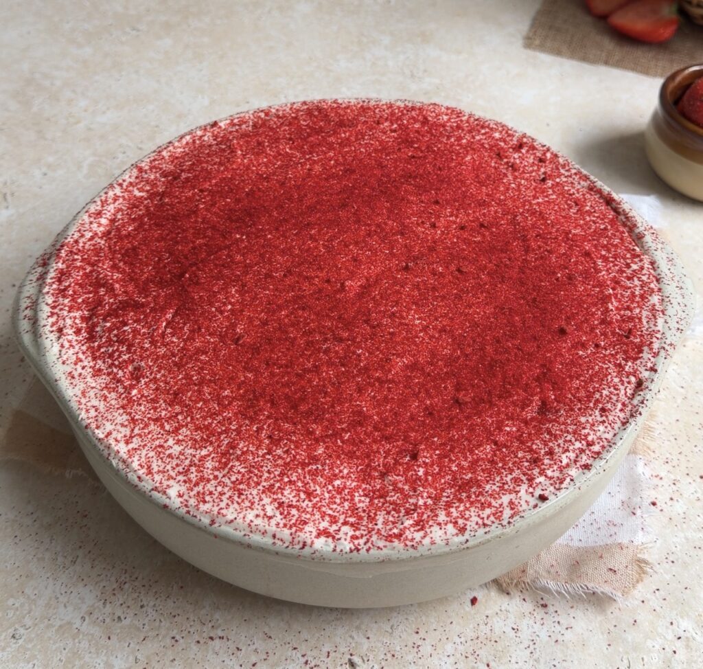 - Dust the top with crushed freeze-dried strawberries and decorate with fresh strawberries. Refrigerate for at least 8 hours or overnight before serving.