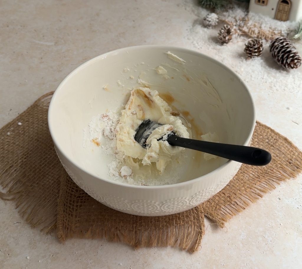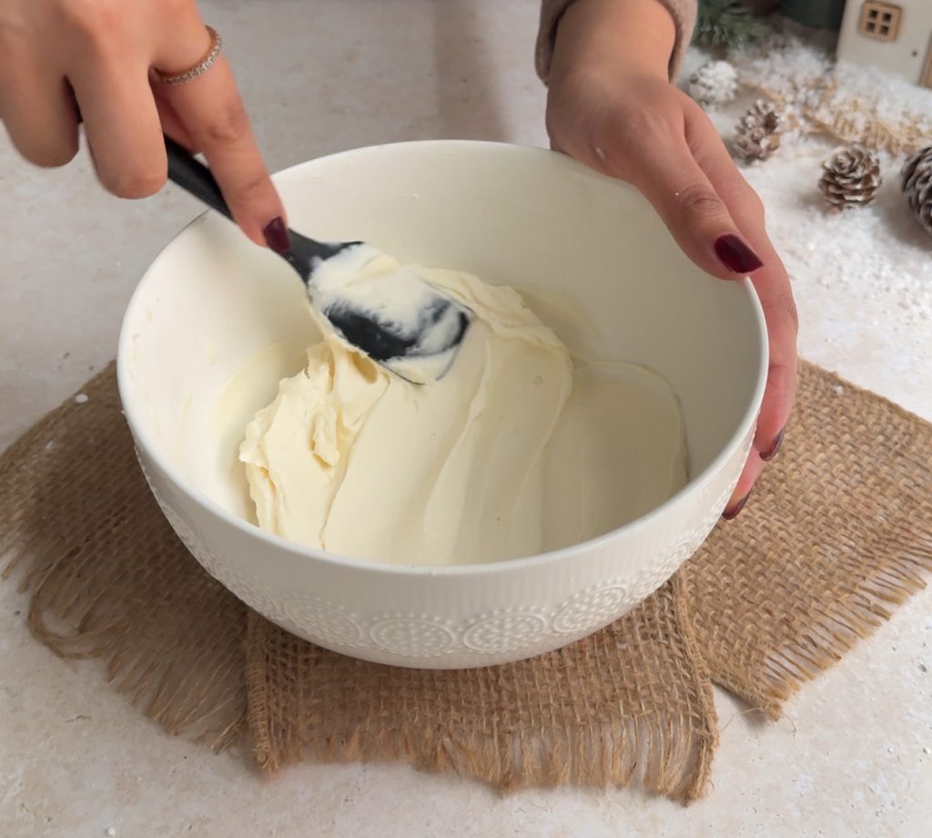 - Start by adding the cold mascarpone and icing sugar to a bowl. Gently soften the mixture with a spatula until it becomes smooth and creamy.