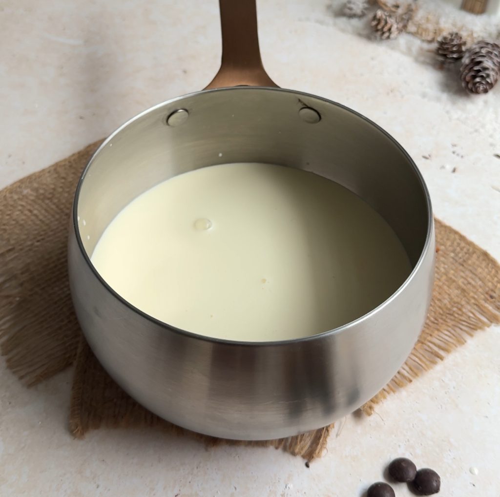 - Pour the milk and heavy cream into a saucepan and place it over medium heat. As it begins to warm, whisk gently so everything heats evenly without boiling.