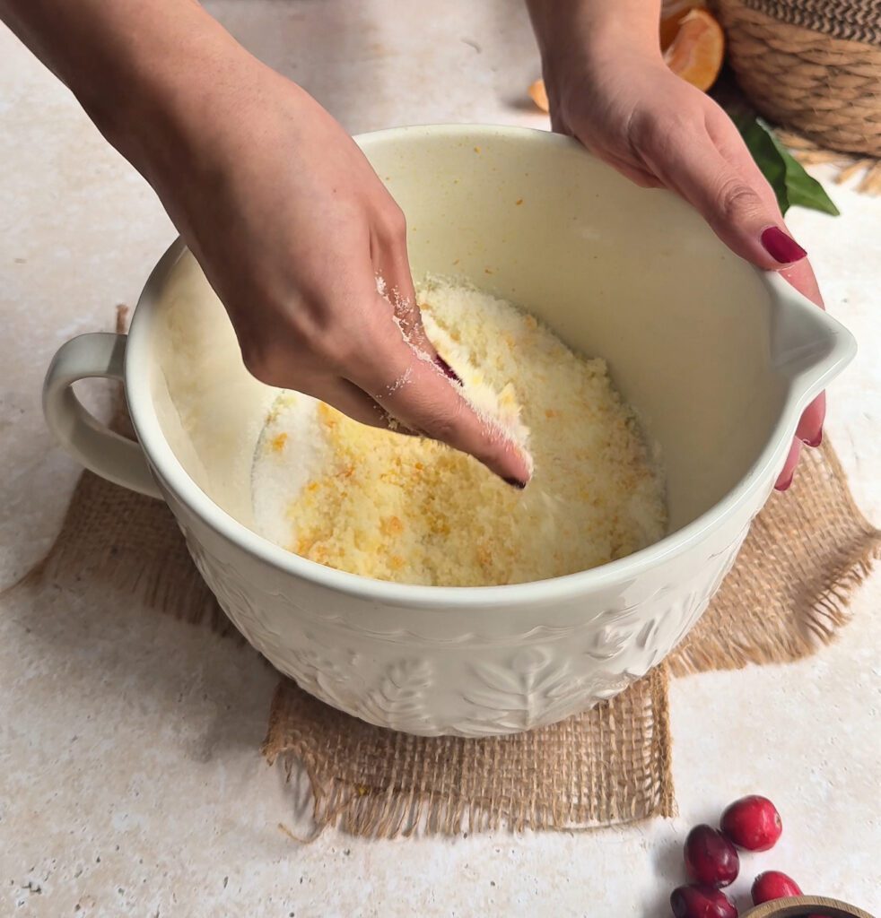 Now, add the orange zest to the sugar and rub them together using your fingertips. This releases the natural oils from the zest and enhances the orange aroma throughout the cake.