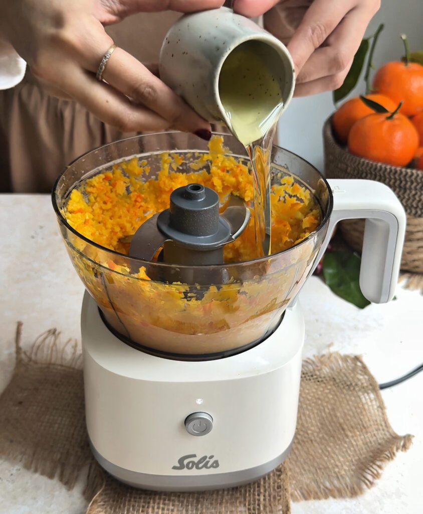 2. Wash the oranges well, then remove the stem and any seeds. Roughly chop them, keeping the peel on. Add the chopped oranges and oil to a blender or multi chopper and blend until you get a thick, smooth purée. Set aside.
