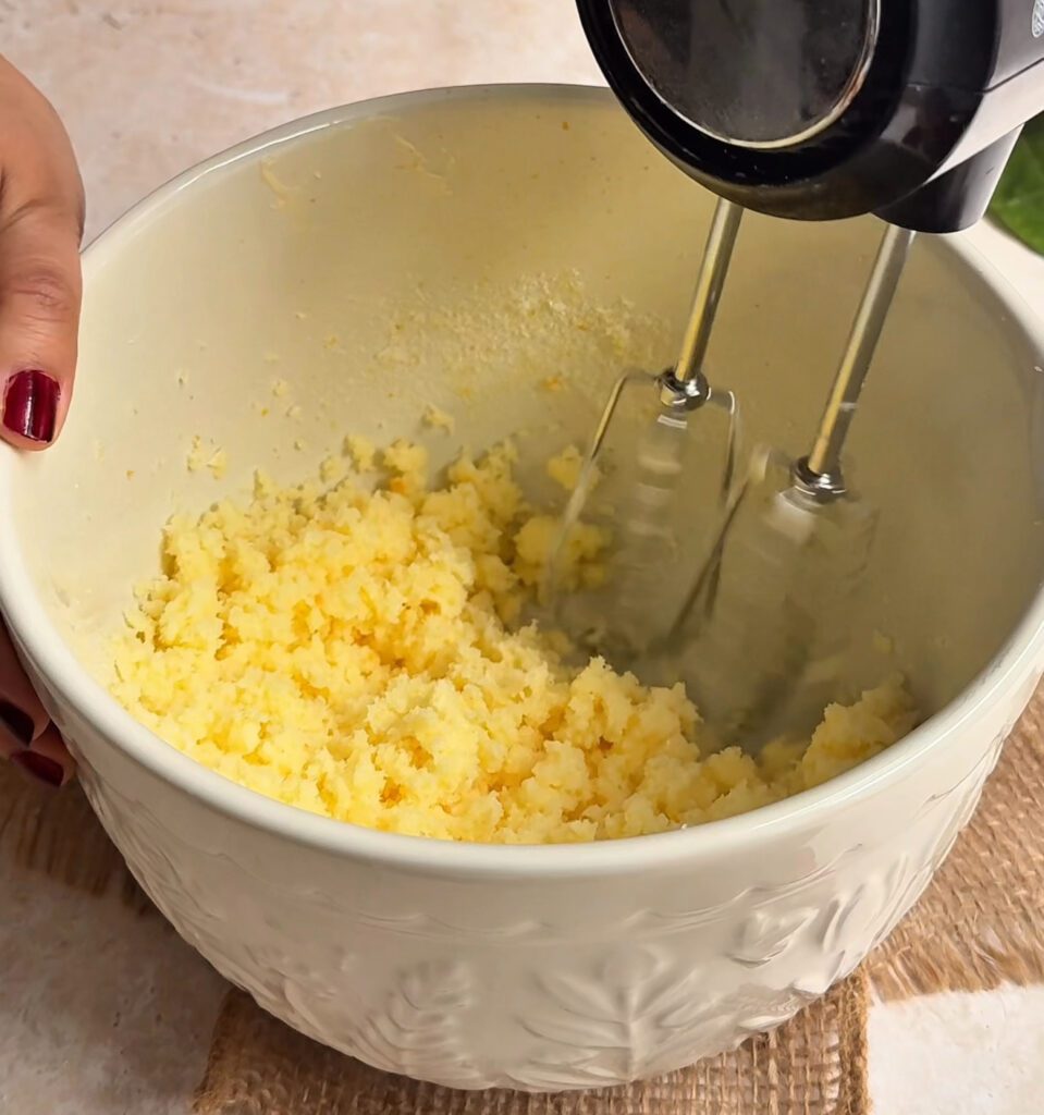 After that, add the softened butter to the scented sugar and whisk until pale, light, and fluffy. This step helps incorporate air into the batter, giving the cake a soft texture.