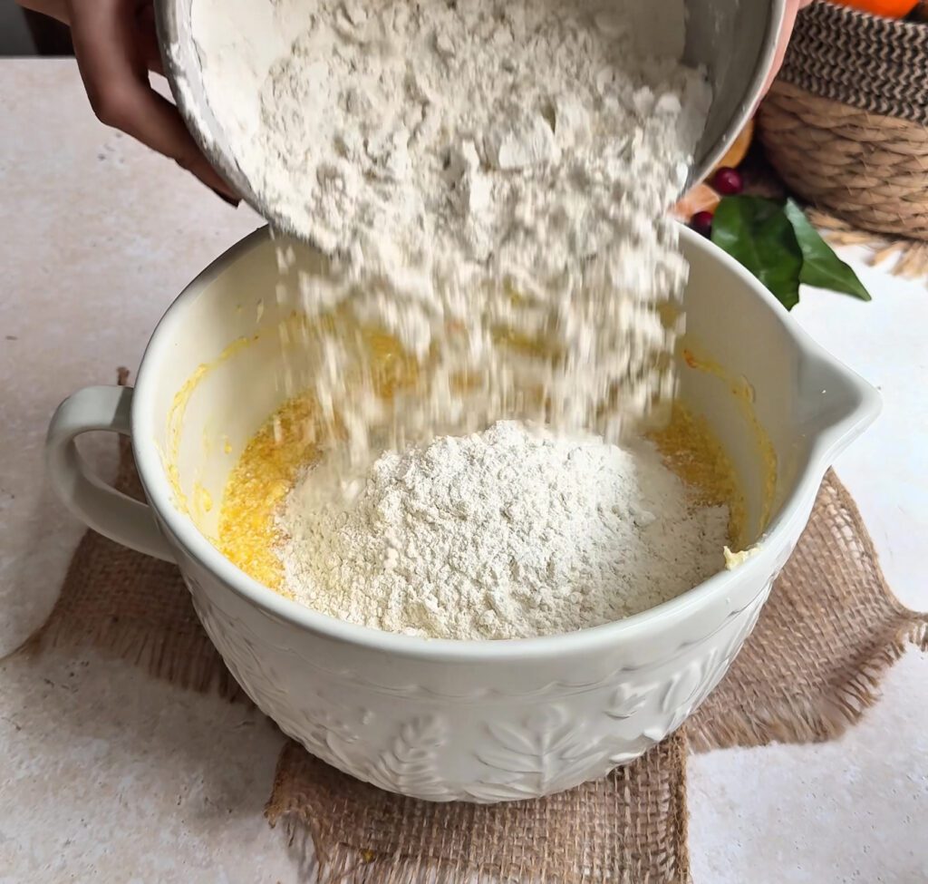 In a separate bowl, mix the flour, corns tarch, baking powder, baking soda, and salt. Gradually fold the dry ingredients into the wet mixture, mixing just until combined to keep the cake tender.