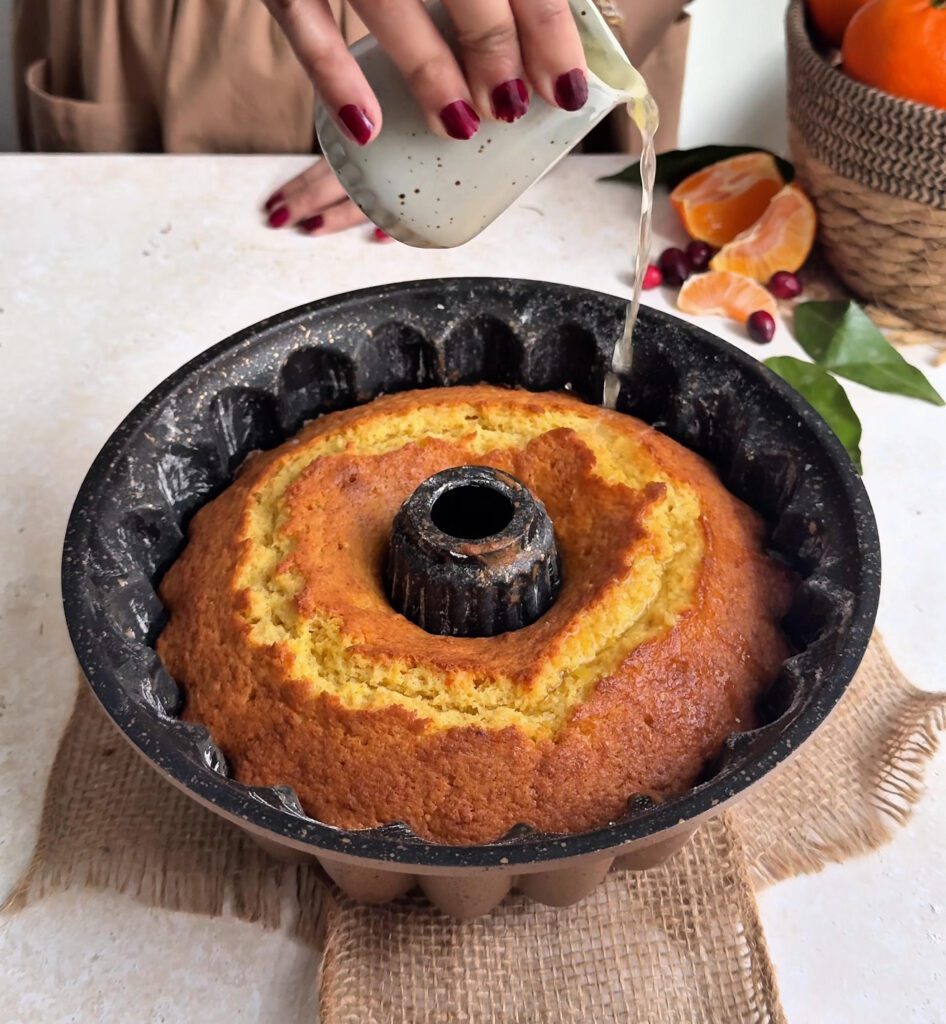 Once baked, let the cake rest for 5 minutes. Then poke small holes over the surface and slowly pour the warm orange syrup evenly over the cake. This helps lock in moisture and intensify the citrus flavour.