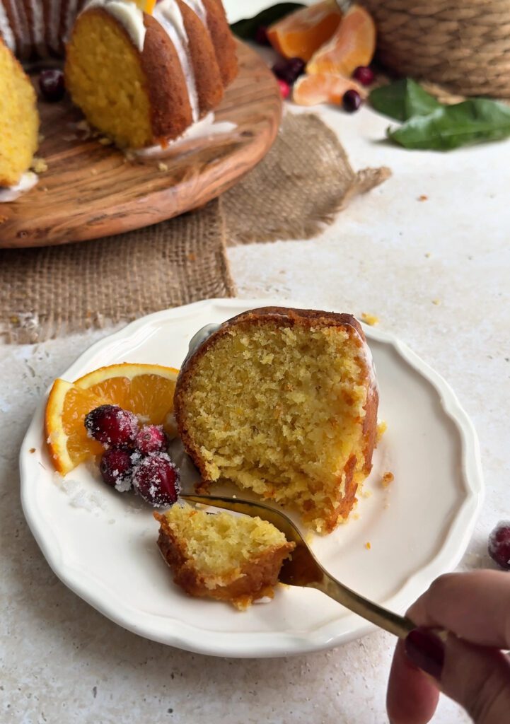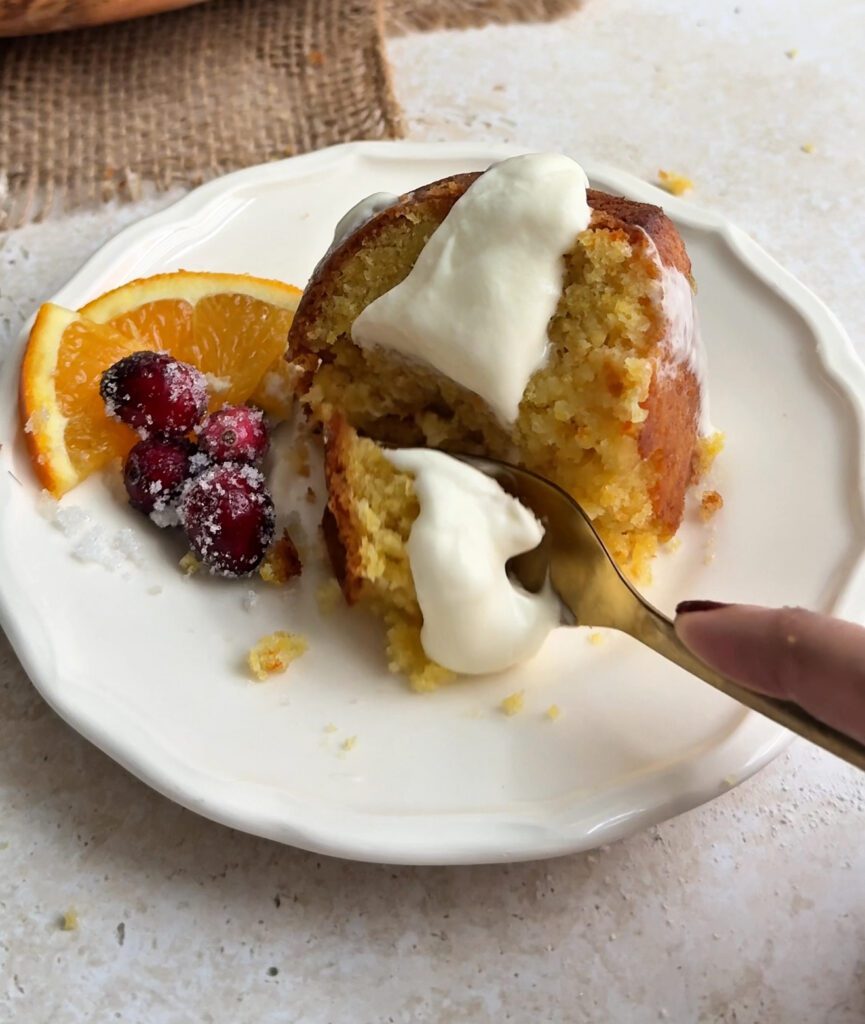 The orange syrup adds extra moisture and enhances the citrus flavor of the cake. Pouring it over the warm cake allows it to soak in evenly, making the cake softer and more flavourful. While the cake is still delicious without it, the syrup truly takes it to the next level.